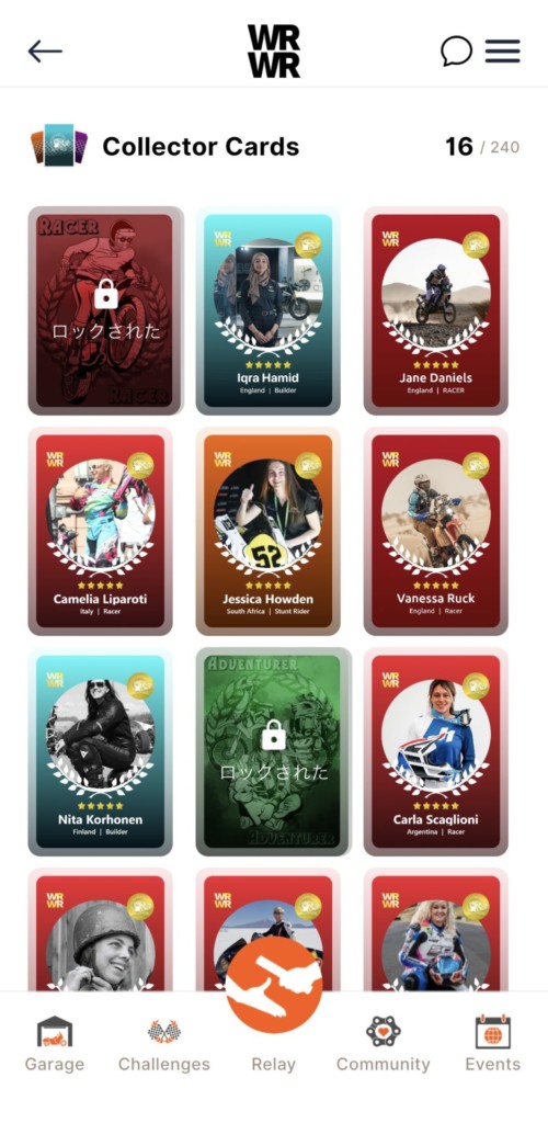 WRWRのアプリは、バトンをつなぐためだけのものではありません。日々のバイクライフを楽しく、続けやすくする仕掛けがたくさん詰まっています。ライディングや安全、メンテナンス、コミュニティ参加など、テーマごとに用意されたチャレンジ企画。達成するとポイントが加算され、コレクターカードを獲得できるんです。バイク女子部でもお馴染みの女性レーサーの先駆け的存在のレジェンドライダー 堀ひろこさん、腰山峰子さんもコレクターカードに。